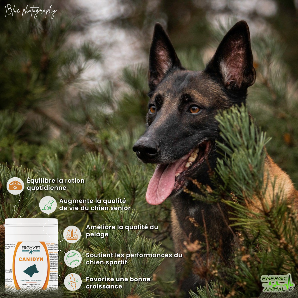 Offrez à votre chien une vitalité optimale avec Canidyn, un complément alimentaire naturel conçu pour soutenir les chiens sportifs, fatigués, en convalescence ou en pleine croissance. Formulé avec plus de 30 ingrédients de qualité, il répond aux besoins spécifiques de votre compagnon à quatre pattes.