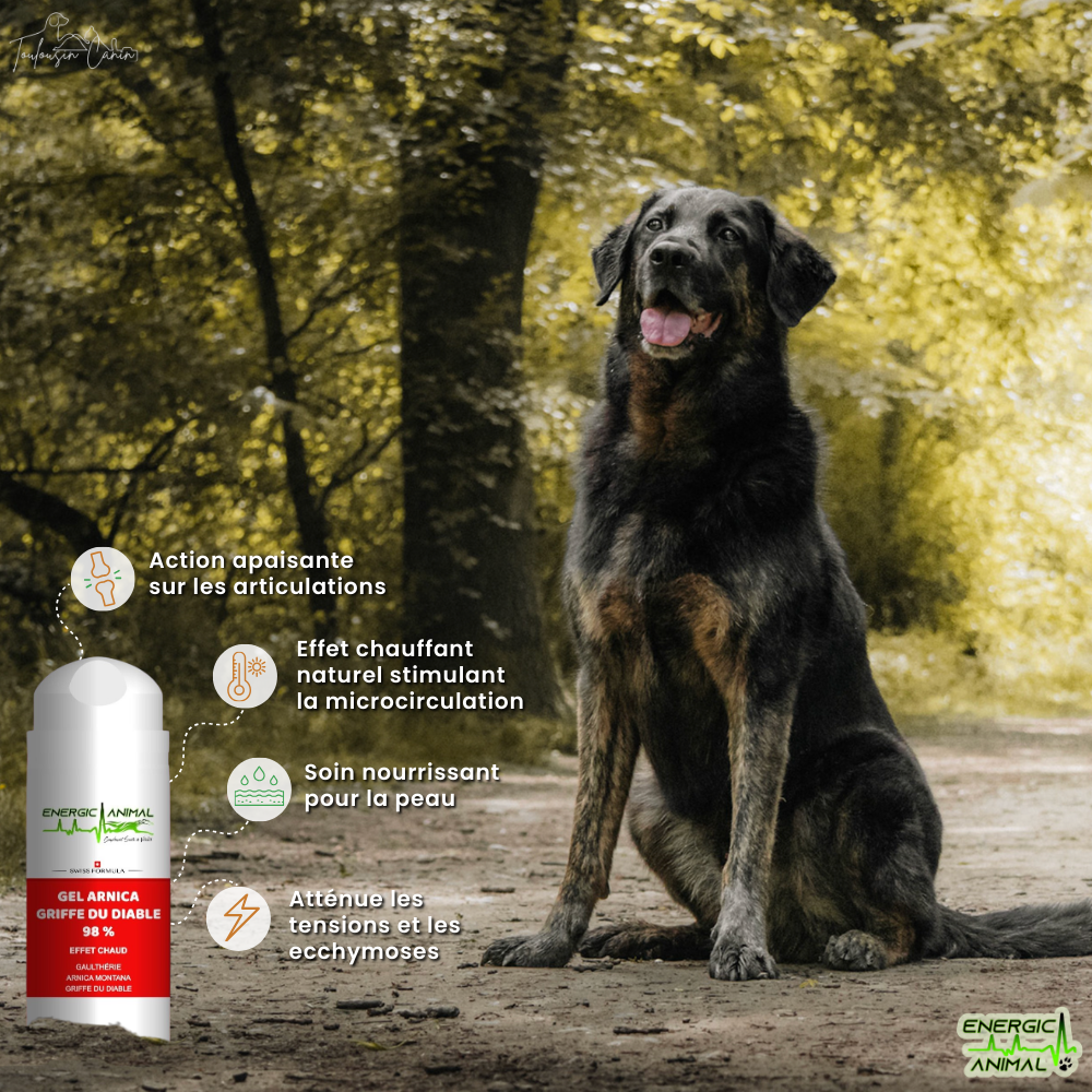 Ce gel à effet chauffant est spécialement formulé pour soulager les tensions musculaires et articulaires de votre chien. Idéal pour les chiens de sport, les seniors ou en période de récupération, il associe des extraits naturels réputés pour leurs bienfaits :