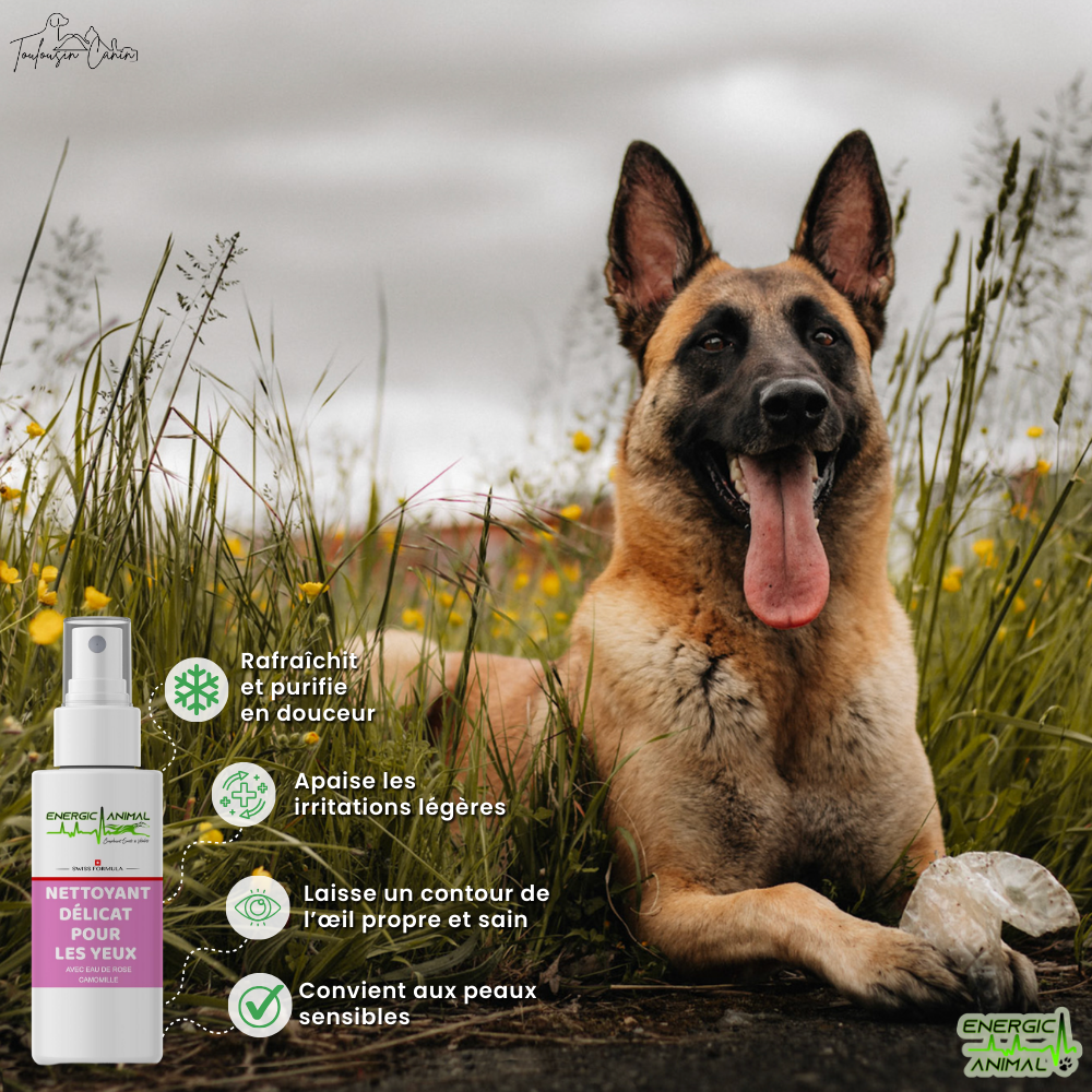 Lotion florale douce pour nettoyer, apaiser et rafraîchir le contour des yeux de votre chien en toute sécurité.